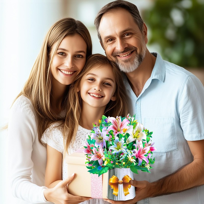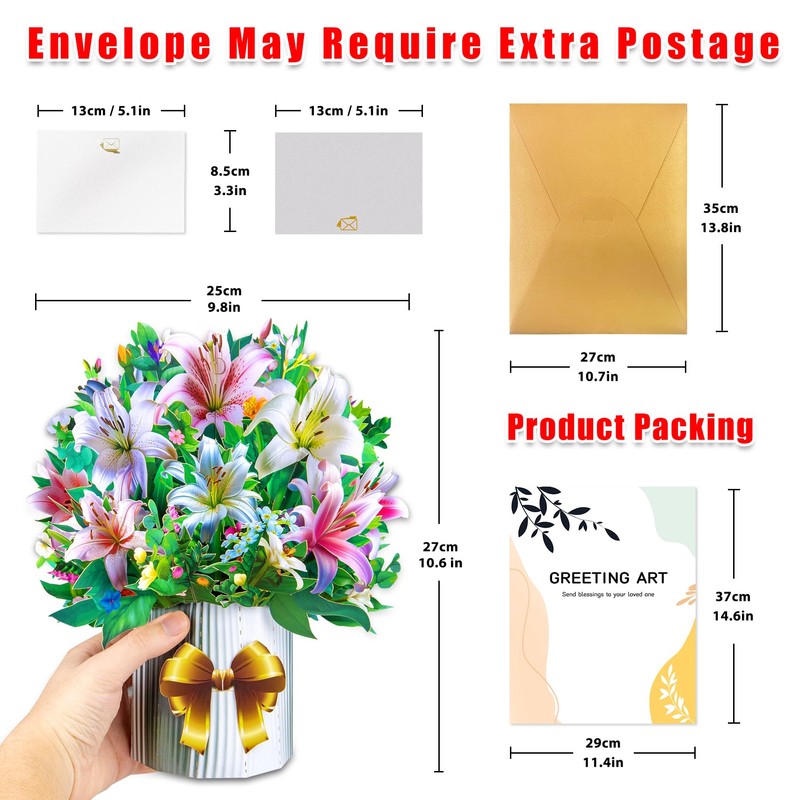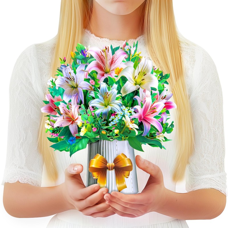 - 3D greeting cards with lily flowers: the card features a detailed 3D design that represents a vibrant bouquet of lilies. The delicate petal design is fully layered and creates the illusion of a real bouquet, a feast for the recipient for the eyes.