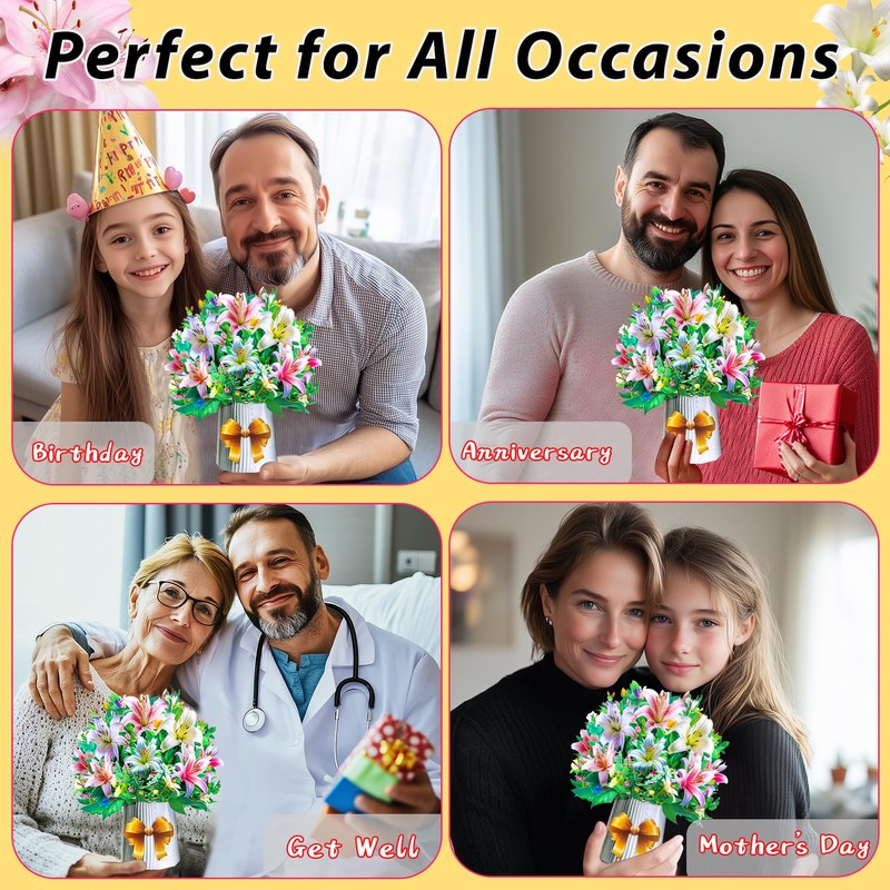 - Warm Wishes This pop up card with a bouquet of flowers is not only a gift, but also a sincere, heartfelt message. Each lily symbolizes purity and elegance, effectively expresses your blessing and care for the recipient and evokes feelings of warmth and joy.