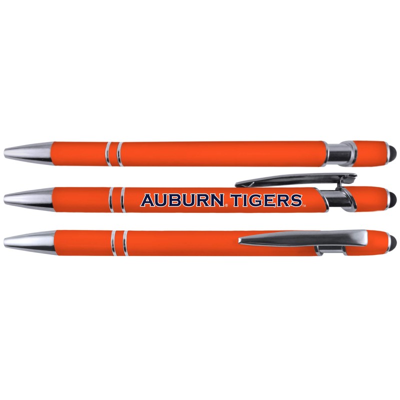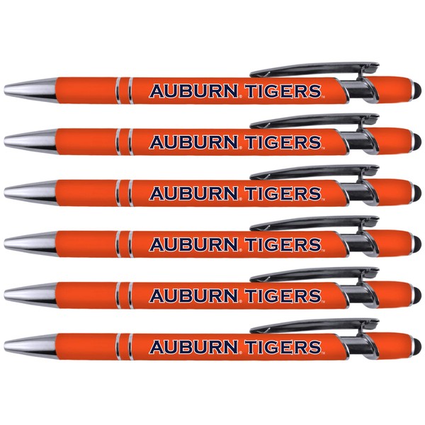 Auburn Comfort Feel Metal Pens - 6 Pack: Each pen is a pen with a soft barrel that provides comfortable writing, featuring school artwork. They also have a stylus on the end so that they can be used on touch screen devices. NCAA licensed. Pens are 1mm ballpoint, retractable pen with black ink.