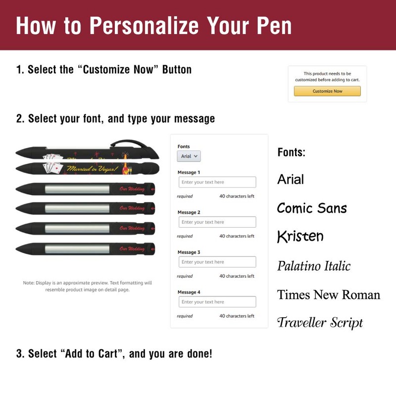 - Customize this pen with your own message to use as invitations, or to use as a party favor at your Wedding! Complete a Vegas-themed Wedding with this pen!