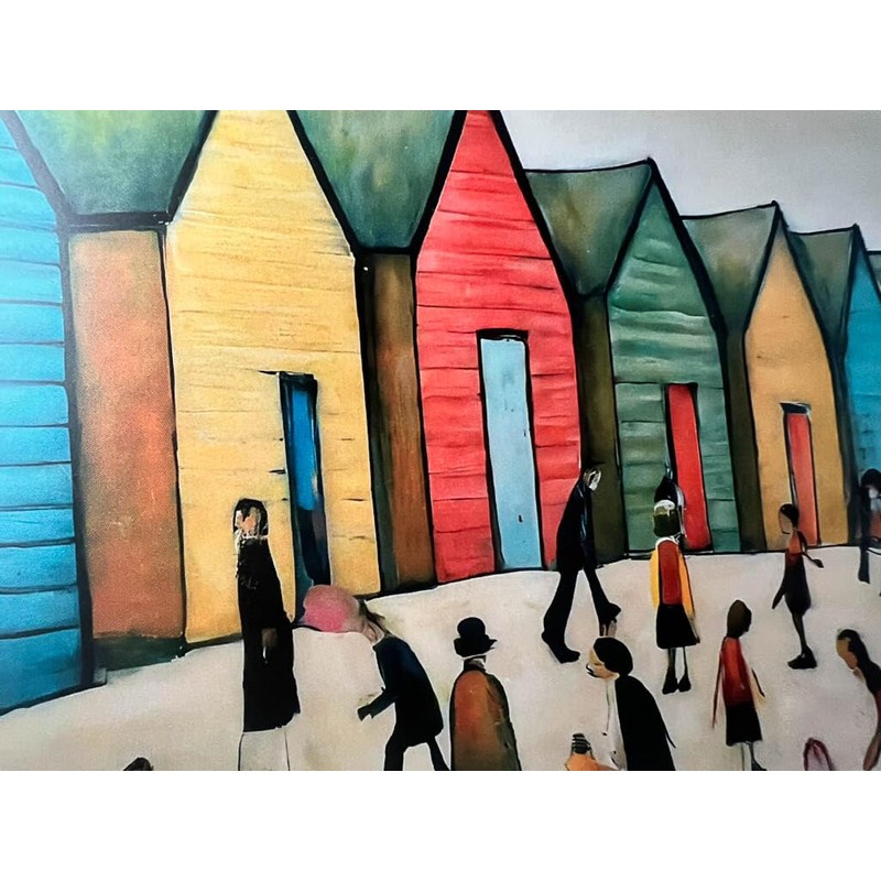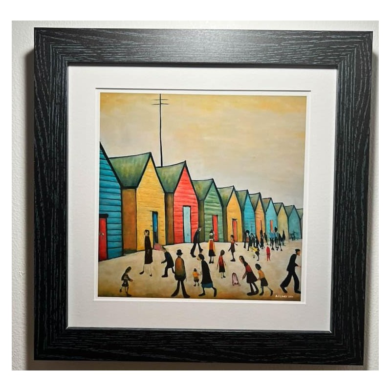 - Framed Lowry-Style Print. Inspired by L.S. Lowry, this artwork captures the iconic, colourful beach huts of Brighton, evoking a sense of coastal fun and relaxation. Housed in a 12-inch square (30.5cm x 30.5cm) black ash frame, it adds a vibrant touch to any room.