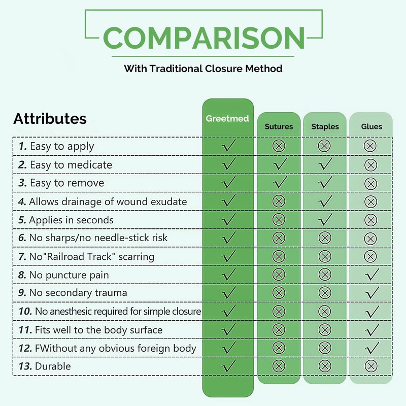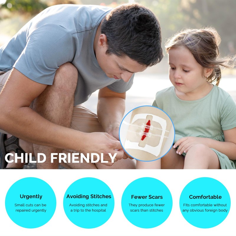 - Easy to Use and Remove, ReliableWith our wound closure device, you can easily, quickly and non-traumatically close the cut wherever you are, and you can peel the device like a dressing from the skin after healing. It can be counted on in emergencies and save time when every second counts.