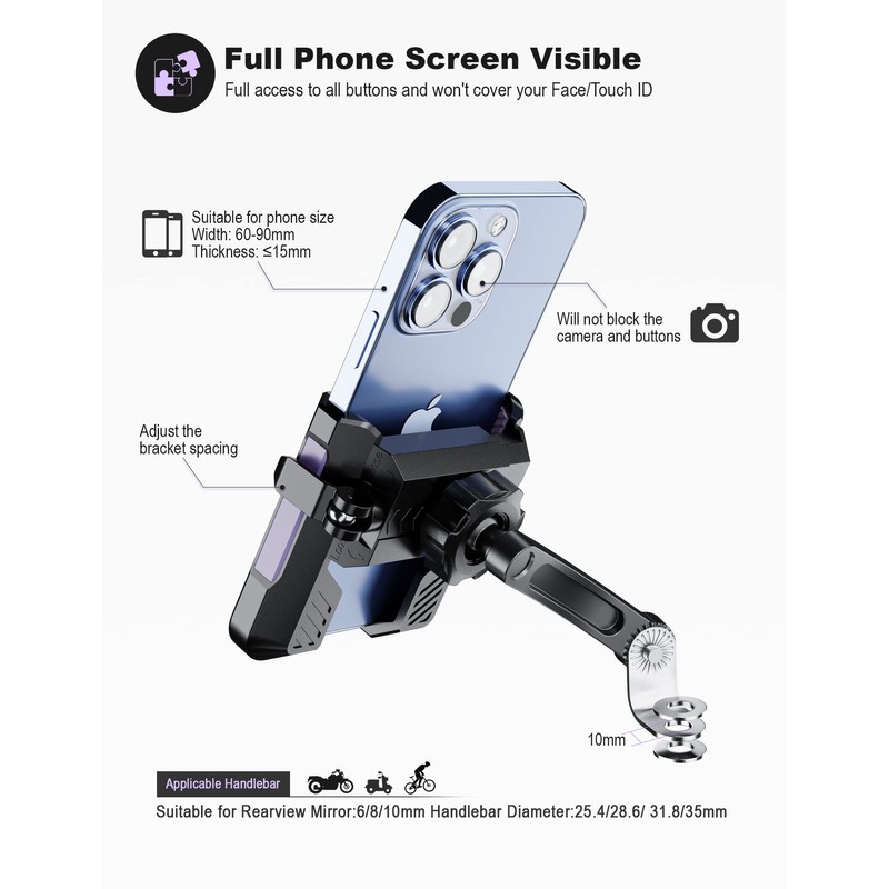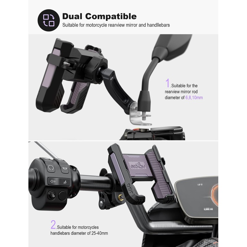 - 【Compatible con manillar de motocicleta + espejo retrovisor de motocicleta】 2022 nuevo soporte para teléfono para motocicleta, 2 métodos de conexión. 1. Adecuado para motocicletas y scooters eléctricos con barras de espejo de 6/8/10 mm. 2. Para manillares de 25 a 40 mm de diámetro, incluye 4 piezas de goma antivibración de silicona. Nota: Adecuado para la mayoría de los dispositivos con un grosor de ≤15 mm y un ancho de ≤60-90 mm, longitud ilimitada.