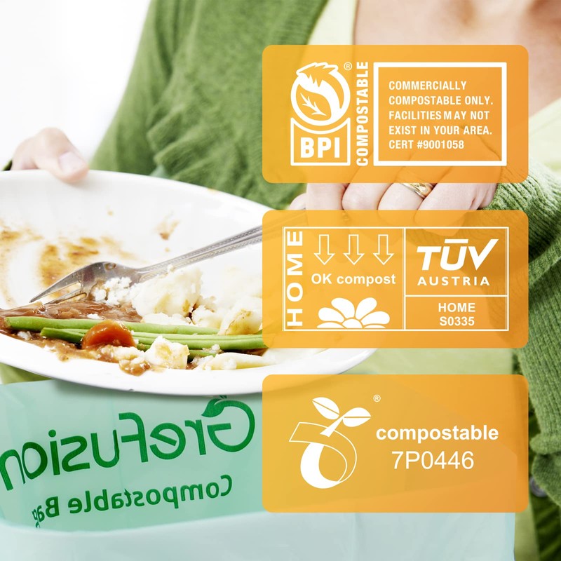 GreFusion 10 Litre Compostable Extra Strong Organic Bin Liners with Handle, Pack of 50 Compost Organic Bin Liners with Practical Carry Handle