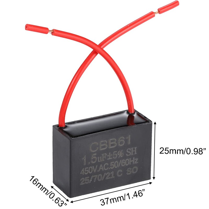 - Capacitor module: CBB61 fan capacitor, Capacity: 1.5uF, Tolerance: ±5%, Dielectric strength: 450V AC, Frequency: 50/60Hz.