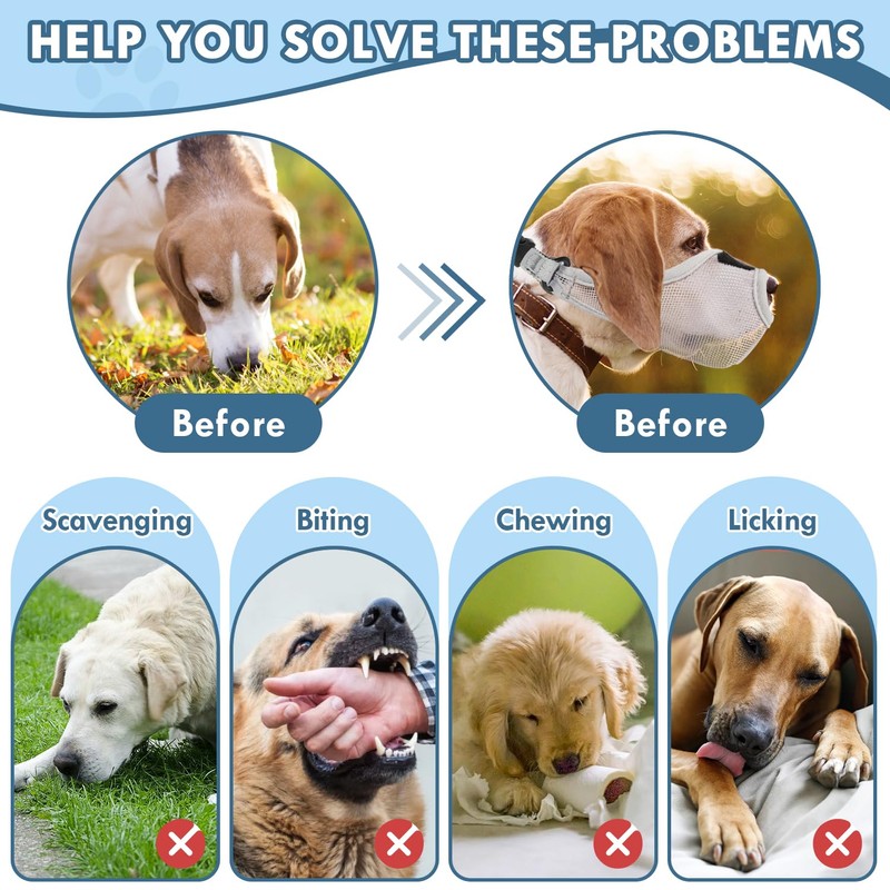 • Breathable Design: The innovative front opening design makes this mesh dog muzzle more breathable than traditional enclosed muzzles. The soft material prevents stuffiness and rubbing, allowing your dog to pant easily and stick out their tongue for heat dissipation. The front opening also enables easy treat rewards