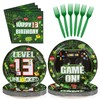 - Green Game 13th birthday Tableware Set: Our 96 piece video game plates sets includes 24 9inch 7th game on dinner plates, 24 7 inch level unlcked dessert plates, 24 6.5 inch happy 13 birthday napkins, and 24 green forks, each set can accommodate 24 guests. This video game party plates is designed specifically for a 12 year old boy's birthday and will bring gamer the perfect birthday party experience