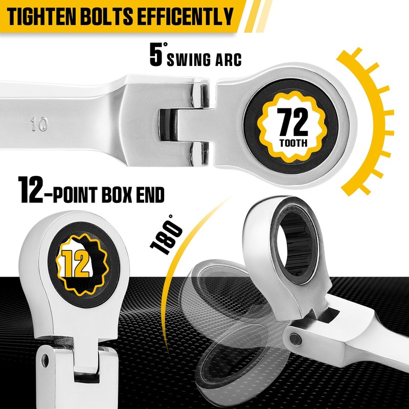 - Flex-Head,12-Point,72-Tooth:Ratchet head can rotate 180° ,Convenient to use in various spatial angles.72 tooth ratchet gears need only 5 degree working swing arc, suitable for tight space. 12-point full-drive box end offers firmer grip and more reliable torque to tighten and loosen any bolt or nut easily and more effortlessly without rounding.You won’t get tired of twisting the long wrench all day long