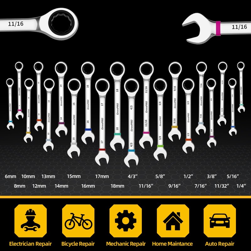 GRENPRO Ratcheting Wrench Set Metric and Standard & SAE, 21pc Combination Wrench Sets 1/4" to 3/4" & 6-18mm, Box & Open End Wrenches Set, Ratchet Wrenches with Color Ring, 72Th CR-V Hand Tools Sets