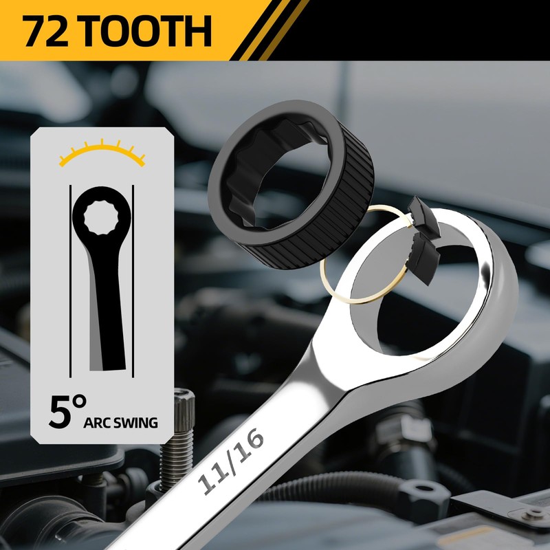 - 72-Tooth Ratcheting Mechanism: The precision-engineered 72-tooth gear system requires only a 5° swing arc for operation in tight spaces, while the 12-point box-end design delivers maximum torque transfer and prevents fastener rounding