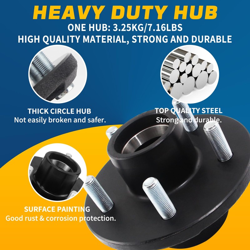 - 【HEAVY DUTY & ANTI-RUST】- These hardware are made of high quality steel and rubber, strong and durable. Wheel hub surface with black coating, and dust cap surface zinc-plated, anti-corrosion & anti-rust, long-term service for your trailer.