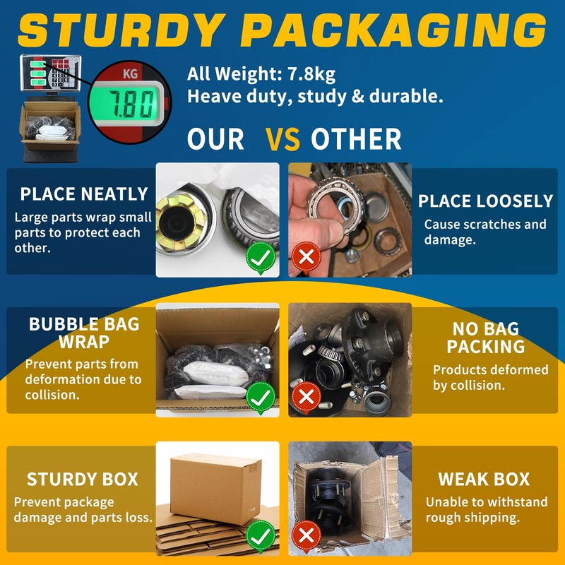 - 【STURDY PACKAGING】- The trailer hubs are wrapped with a bubble bag. Other installation hardware are wrapped in white bubble bags. All parts are neatly placed in a sturdy cardboard box. The products are protected as much as possible during transportation to prevent deformation and wear.