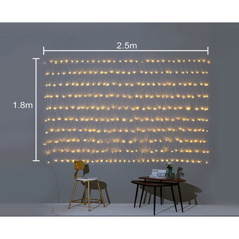 • ??320LED Net Lights Specification8.2ft x 5.9ft (2.5m x 1.8m) Gresonic bright warm white lights have a total of 320 super-bright LEDs, together with extra 10 meters long power cord. And there are also other choices (160LED in 2m x 1m and 270LED in 3m x 3m) to suit more scenes and make everything beautiful and lovely. They are very easy to operated and don't get tangled.