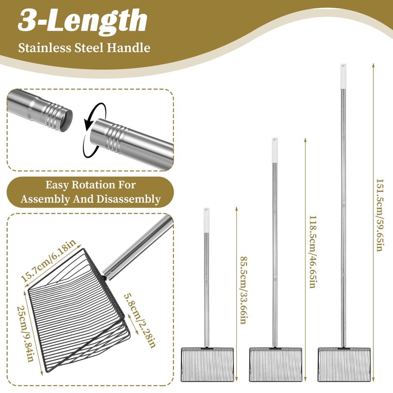 - 【Versatile Design】The 3-in-1 adjustable chicken poop scooper features a stainless steel handle that extends up to 53.62 inches, allowing for easy cleaning in both large and small spaces. Its ergonomic design ensures comfort and efficiency, making it an essential tool for chicken coop maintenance.