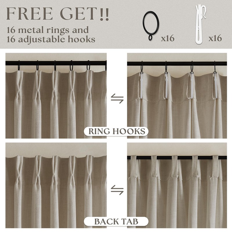 - Versatile Hanging Options: Method 1: Hanging with our hooks and rings to easy slide and creat a classic pleated effect. Method 2: Using back tab to hide the rod, easy to hang and showcase a casual look. Method 3: Using our adjustable hooks for track system. Method 4: Using clip rings(not included).Install according to your preference