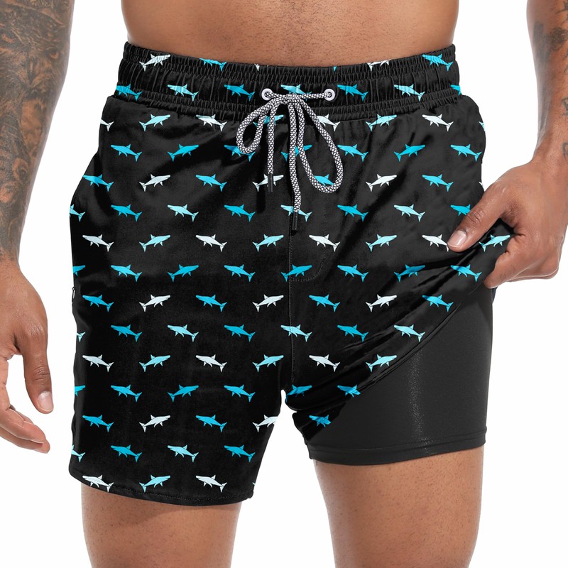 Grey Blue Shark Board Shorts, Mens Swim Trunks with Compression Liner, 5.5 in...