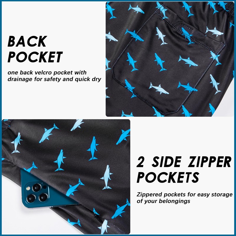 • Upgrade Pocket Design: Featuring 2 zip side pockets and 1 back pocket with velcro closure. Modern fashion style and slim fit swim shorts. The males board short's length is above your knee, it'll show your charming figure and high grade at the same time.
