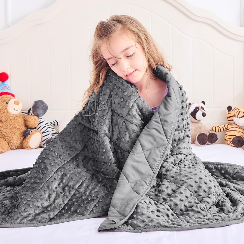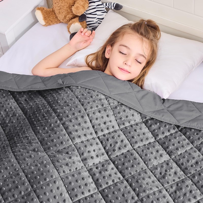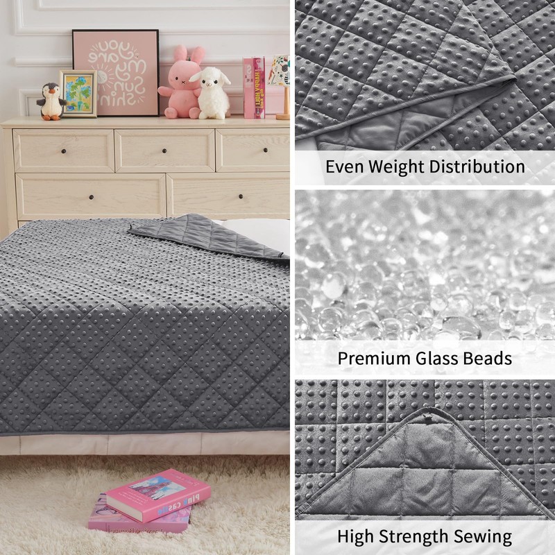 - CHOOSE RIGHT SIZE: As a weighted blanket, kis would be relieved by the warmth hug provided by its gentle pressure of evenly distributed glass beads of without soreness in muscles and bones. Choose the right size to get a comfortable experience. Research recommends the weighted blanket should be a minimum of 10% of yours weight. If you are trying for the first time, a lighter heavy blanket is more suitable.