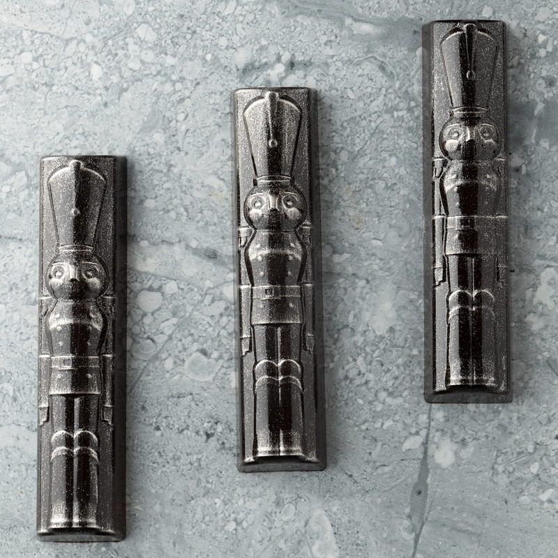 - 1 mold with 6 rectangular cavities having a top that's sculpted into a Christmas nutcracker