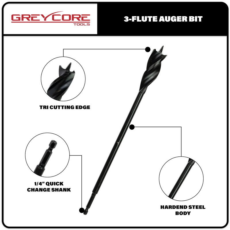 Greycore Tools 1/2 Inch x 16 Inch 3-Flute Auger Bit, Wood Drill Bit for Hard and Soft Wood, 1/4” Quick Change Shank, Woodworking Auger Bits (1/2” x 16” Auger)