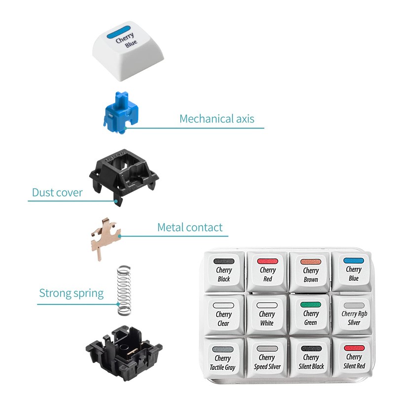 • 1 for 12: This cherry mx switch tester shares you exactly the same press feeling on a cherry mx switch mechanical keyboard. Like owning 12 mechanical keyboards, 12 different switches will help you to tell what your favorite type is.