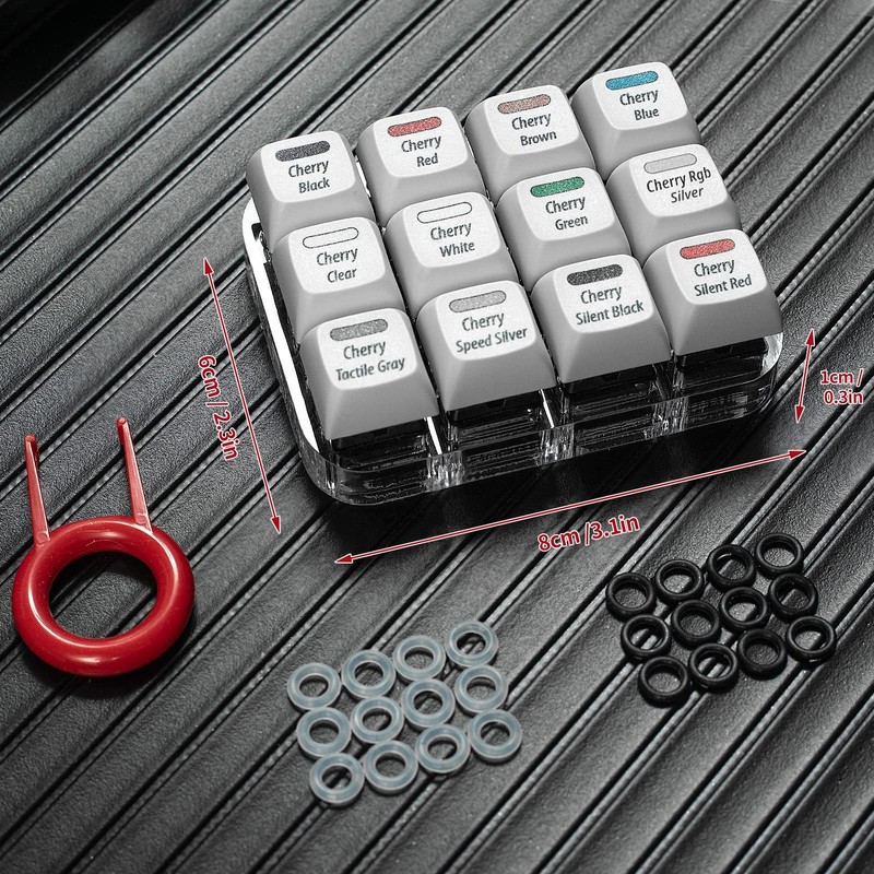 • 24 O-rings Samples: Our Cherry MX switch tester comes with two kinds of sound-dampening rubber O-ring samples (12 40A-L & 12 40A-R), you will know what a key with an O-ring underneath feels like. Note that black ones are 40A-L with 0.2mm reduction; clear ones are 40A-R with 0.4mm reduction.