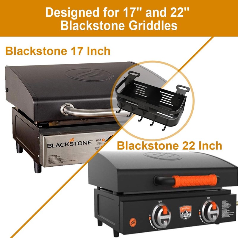- Designed Specifically for Blackstone Griddles 17'' and 22'' Blackstone griddle models. As the ultimate Blackstone accessory that provides a neat, convenient place to store your barbecue sauce bottles and hang cooking utensils.
