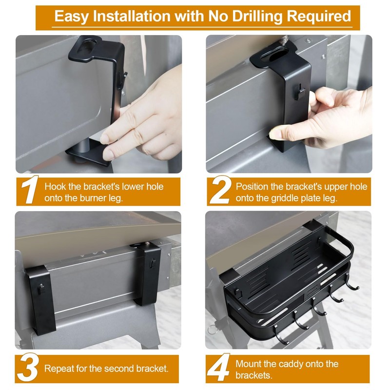 - Easy, Drill-Free Installation: The griddle caddy is designed for hassle-free setup. No need for drilling or complicated tools. Simply attach it to your griddle, and it's ready to use. This user-friendly feature makes it ideal for every grilling enthusiast.