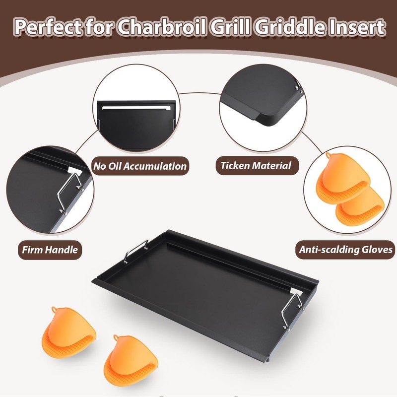 - 【What Will You Get】1-pack Fit for Charbroil Grill Griddle Insert + 2-pack Silicone Oven Mitts. Our grill flat top griddle for Charbroil grill replacement parts have an angled design that directs grease into the drain hole, allowing it to drain easily into the drip pan and preventing leaks. No oil leaks and easy to clean, saving you time and energy