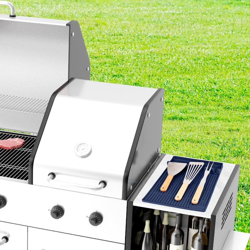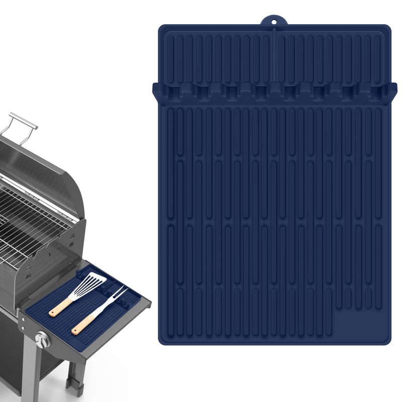 - 【Ideal Gift Choice】 Perfect for holding spoons, spatulas, ladles, brushes, tongs, forks, and grill BBQ caddy seasoning jars, this silicone spatula mat is a practical addition to any kitchen or countertop. Say goodbye to staining countertops with dirty spatulas! It makes an excellent gift choice for Grill BBQ enthusiasts and is perfect for Blackstone side shelves