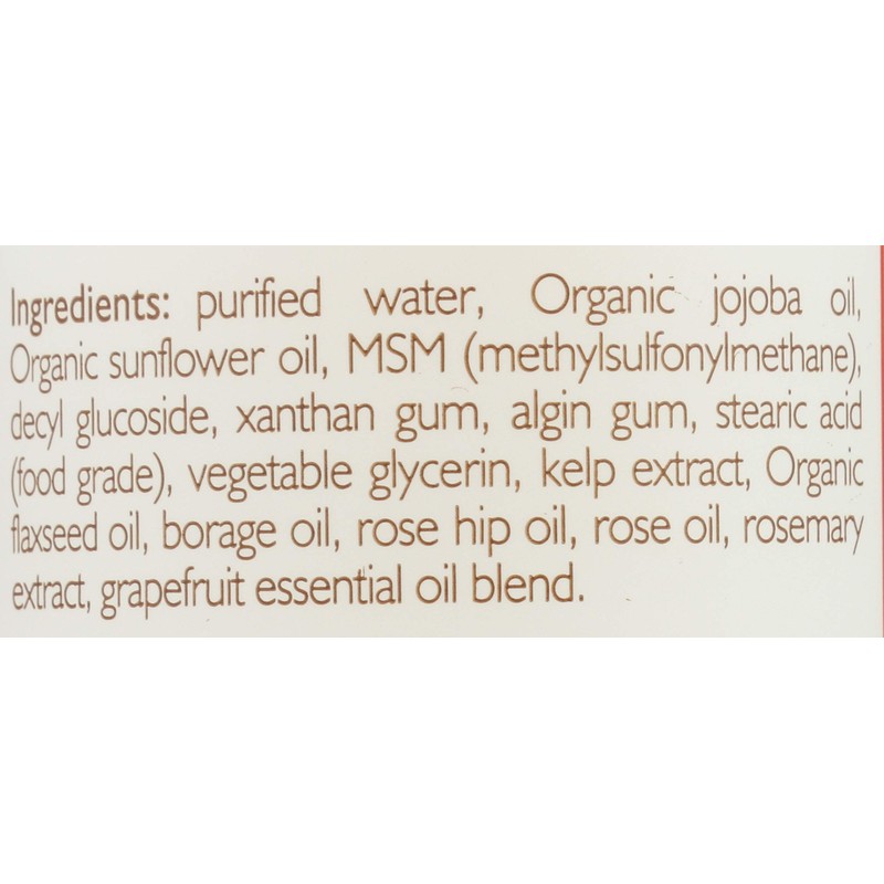 INGREDIENTS: Purified water, Organic jojoba oil, Organic sunflower oil, MSM (methylsulfonylmethane), decyl glucoside, xanthan gum, algin gum, stearic acid (food grade), vegetable glycerin, kelp extract, Organic flaxseed oil, borage oil, rose hip oil, rose oil, rosemary extract, and grapefruit essential oil blend