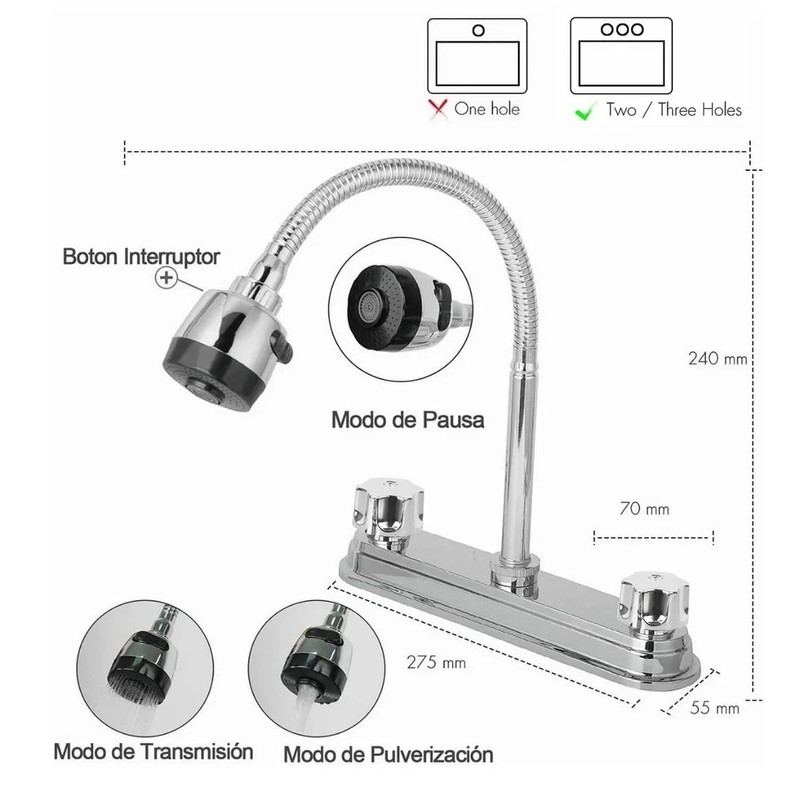 - 【Material de calidad】: Mangos de zinc: durabilidad y resistencia. Acabado cromado espejo: para mayor brillo y resistencia. Cartucho de latón, caño flexible de acero inoxidable con doble función (rociador o chorro), tapa de plástico.