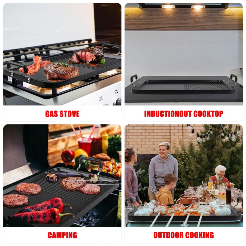 - 【DUAL-ZONE GRILL & GRIDDLE】Cook meats and sides simultaneously. The double sided griddle side locks in juices for perfect steaks, burgers, and kebabs, while the grill pan for indoor cooking side evenly cooks pancakes, tortillas, and veggies. Perfect for busy mornings or backyard BBQs