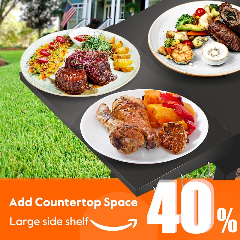 - Spacious Workspace: M Karmater portable grill cart with dimensions of 44.2" L x 16.9" W, this large and rugged steel metal tabletop offers 600 square inches for preparing various foods, seasoning, serving dishes, and other kitchen essentials, supporting up to 400 lbs. Besides, the foldable side shelf adds an additional 14" of prep space and folds down easily to fit perfectly in your outdoor kitchen.