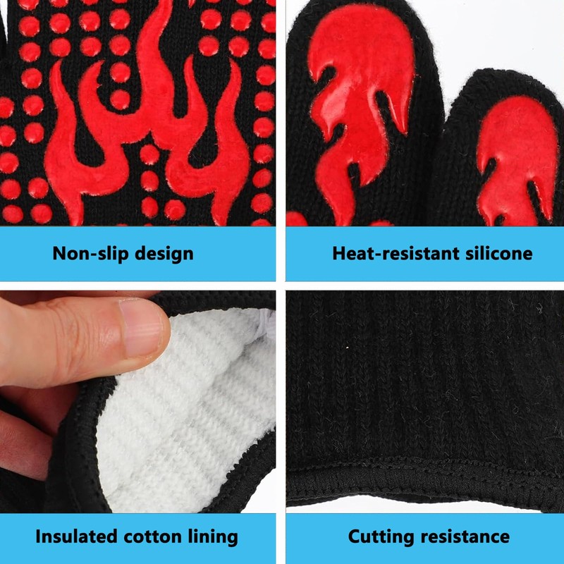 - 【Professioneller Hitzeschutz bis 800°C】Unsere Grillhandschuhe bestehen aus hochwertigem Aramidfaser (flammhemmend), Baumwolle und Silikon – ideal für Grill, Backofen oder Industrie. Schützen Sie Ihre Hände sicher vor extremen Temperaturen (bis 800°C), ohne dass Hitze durchdringt. Perfekt für Pizza-Steine, Gusseisen-Pfannen oder Schweißarbeiten.