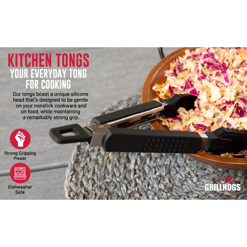 GRILLHOGS 12-Inch Kitchen Tongs Your Everyday Tong for Cooking, Dishwasher Safe, Stainless Steel + Soft Touch Rubber Handle, Non-Stick Silicone Head, Premium Cooking Tongs