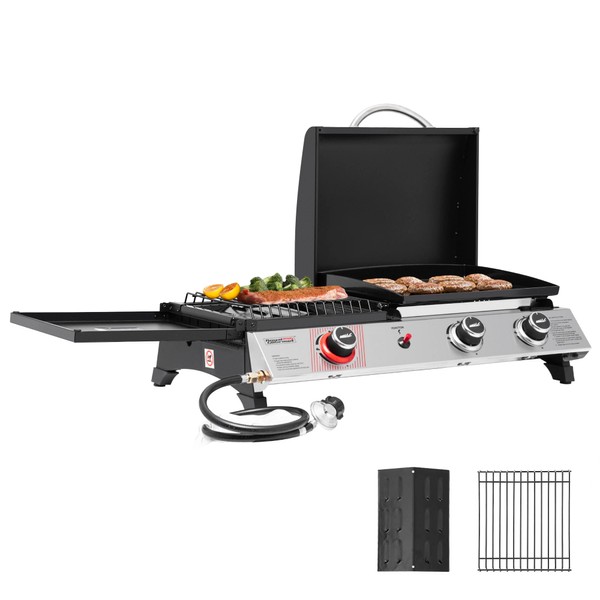 Grills House 3-Burner Portable Propane Gas Griddle with Side Burner, 3-in-1 Grill and Griddle Combo with Lid, Outdoor Cooking, 29,000 BTU, Silver, PD1305H-SC