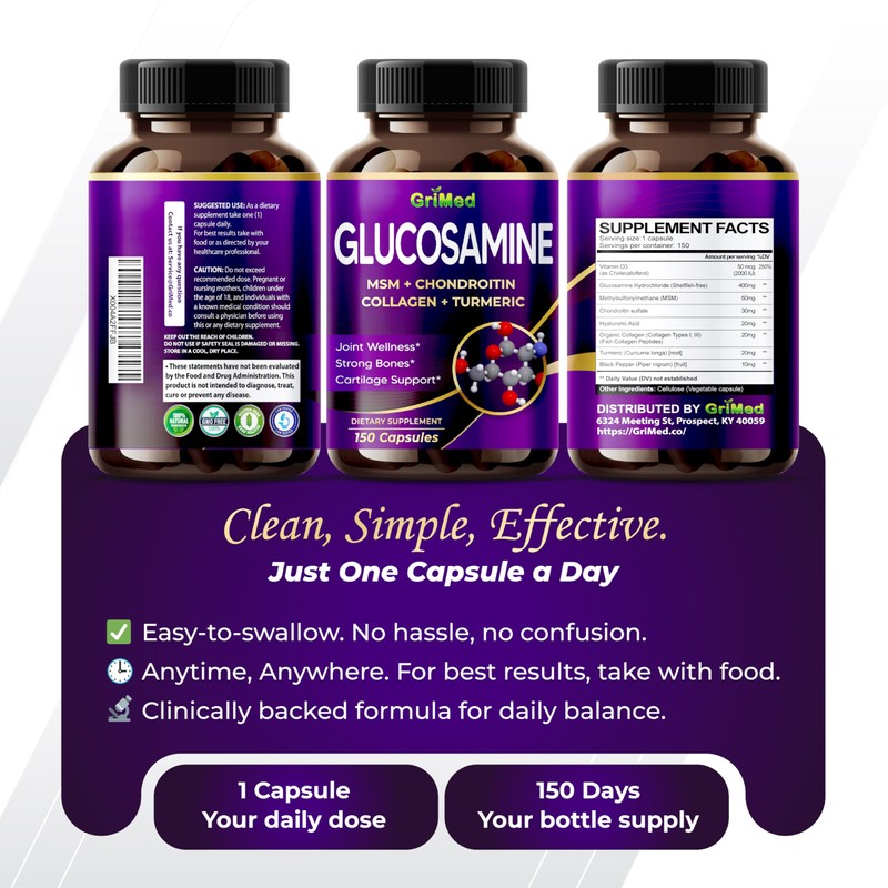 - Unrivaled Formula: GriMed Glucosamine presents a unique combination of 8 precious herbs neatly packed into every capsule. These ingredients encompass Vitamin D3, Glucosamine Hydrochloride, Methylsulfonylmethane, Chondroitin, Hyaluronic Acid, Organic Collagen complex, Turmeric, and Black Pepper. This special blend significantly elevates your overall well-being. No need to manage various supplements anymore – a single daily Grimed Glucosamine capsule delivers remarkable outcomes.