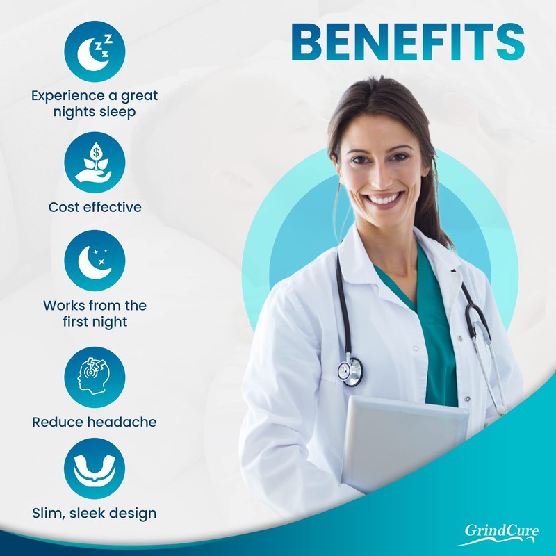 • Grind Cure dental mouth guard has a fixed design which helps protect your teeth from unwanted damage, teeth clenching at night, preserving your beautiful shiny smile. GrindCure has also been known to reduce headaches and eases aching in the neck and shoulders.