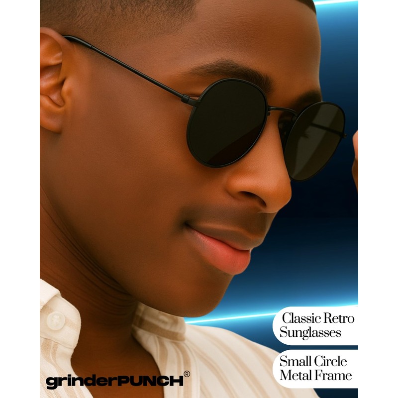 grinderPUNCH Classic Retro Sunglasses for Women Men, UV400 Protection Lens and Lightweight Men Sun Glasses Circle Metal Frame (Black Lens)