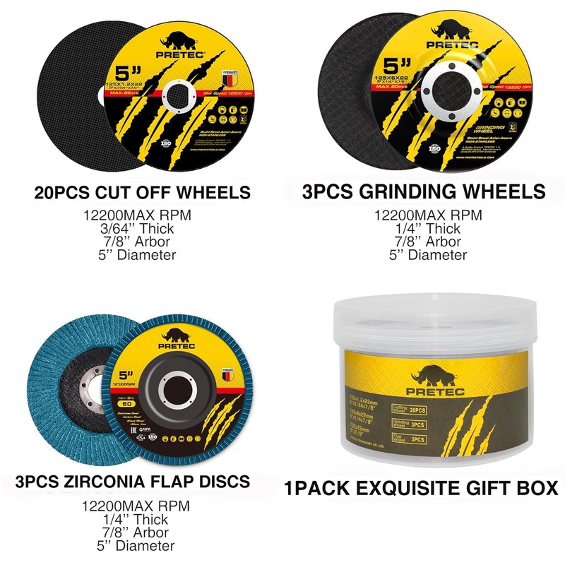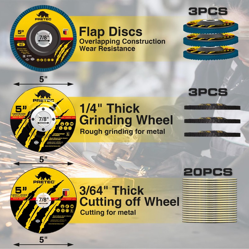 Grinding Cutting Wheels 5 inch Set - PRETEC 5" 20 Cut Off Wheels, 3 Grinding Wheels, and 3 Flap Discs for Angle Grinder Cutting and Grinding 5"x 1/24" x 7/8", 20+3+3 PCS
