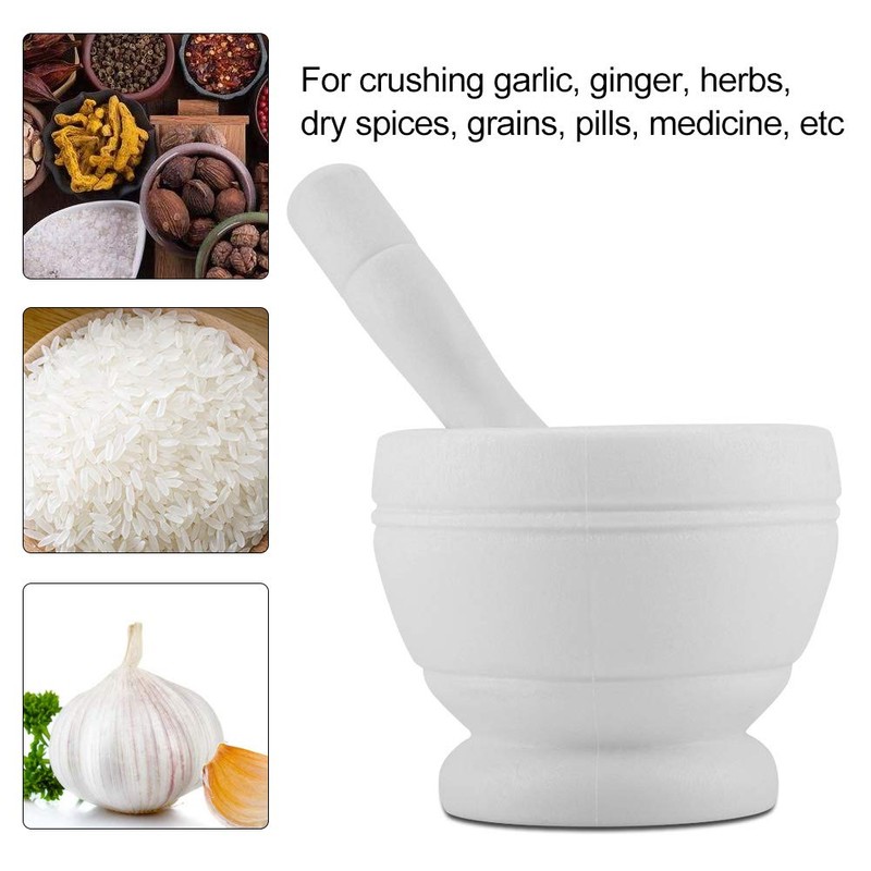 The grinding set includes a mortar and a pestle, perfect for crushing and grinding garlic, herbs, spices, pills, sesame seeds, etc. The whole structure is made of high quality PP plastics, easy to clean, sturdy and durable in use.