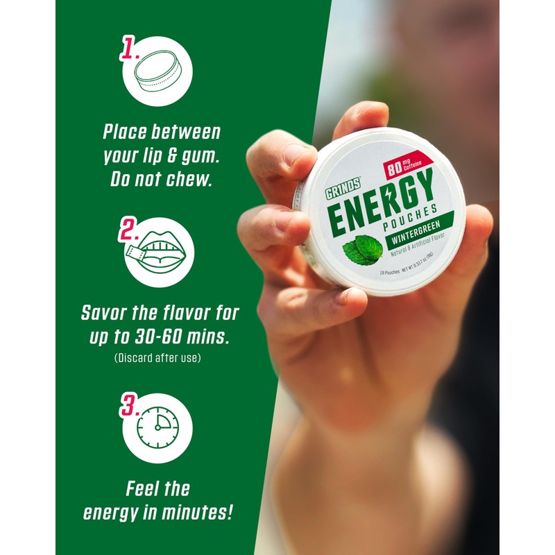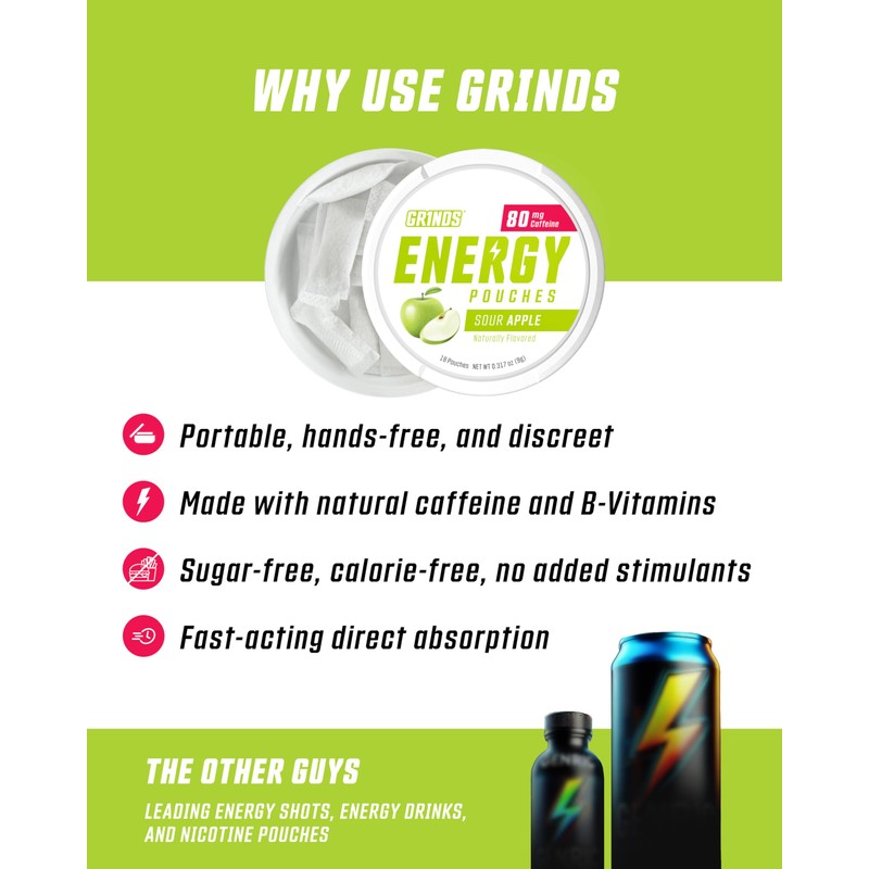 Grinds Energy Pouches - Natural Caffeine Pouches - Contains B-Vitamins, Sugar-Free, & 0 Calories - 80mg of Caffeine in Each Pouch - Wintergreen, Peach, & Sour Apple - 3 Pack, 15 Pouches Per Can