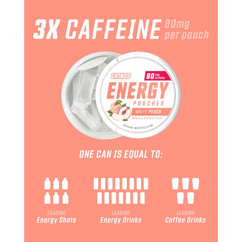 - ZERO CALORIE SATISFACTION: enjoy an immediate burst of long-lasting flavor that is sugar-free, calorie-free, nicotine-free, and GUILT FREE. Grinds Caffeine Energy Pouches are plain white making them a clean, enjoyable choice to curb cravings and take care of your pearly whites.
