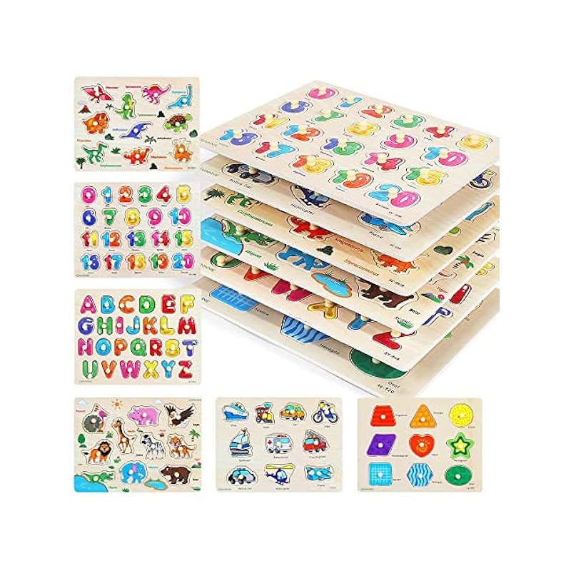 GRINNNIE Wooden Peg Puzzle for Toddlers, 6 Pack Toddler Puzzles Set for 3 4 5 Years Old (Alphabet Number Shape Animal Dinosaur Vehicle), Preschool Education Learning Puzzle Toys for Girls and Boys