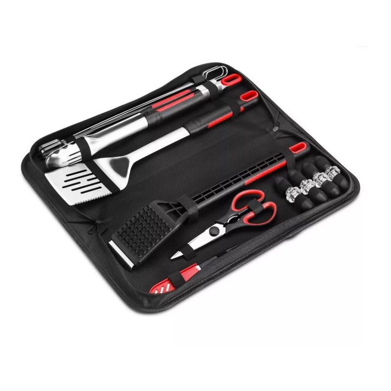 This 18pcs BBQ set includes Basting Brush, Locking Tongs, Spatula, 4 Skewers, 8pcs Corn Holders, Grill Brush, knife, scissor, carry bag. This 18pcs Stainless Steel Soft Grip Barbecue Tool Set by Expert Grill contains all the basic tools you will need for a successful BBQ grilling session. Each piece is made from stainless steel and is built to last. Each tool features an ergonomic soft rubber handle grip for greater comfort and ease of use.