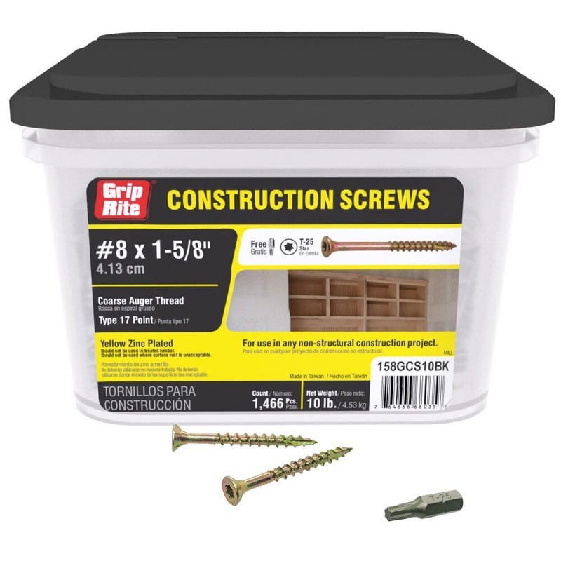 Grip-Rite 158GCS10BK #8 by 1-5/8" T25 Star Drive Gold Construction Wood Screw, 10lb Bucket, Good Choice for Carpentry, Non-Structural framing, siding, Sheet Metal