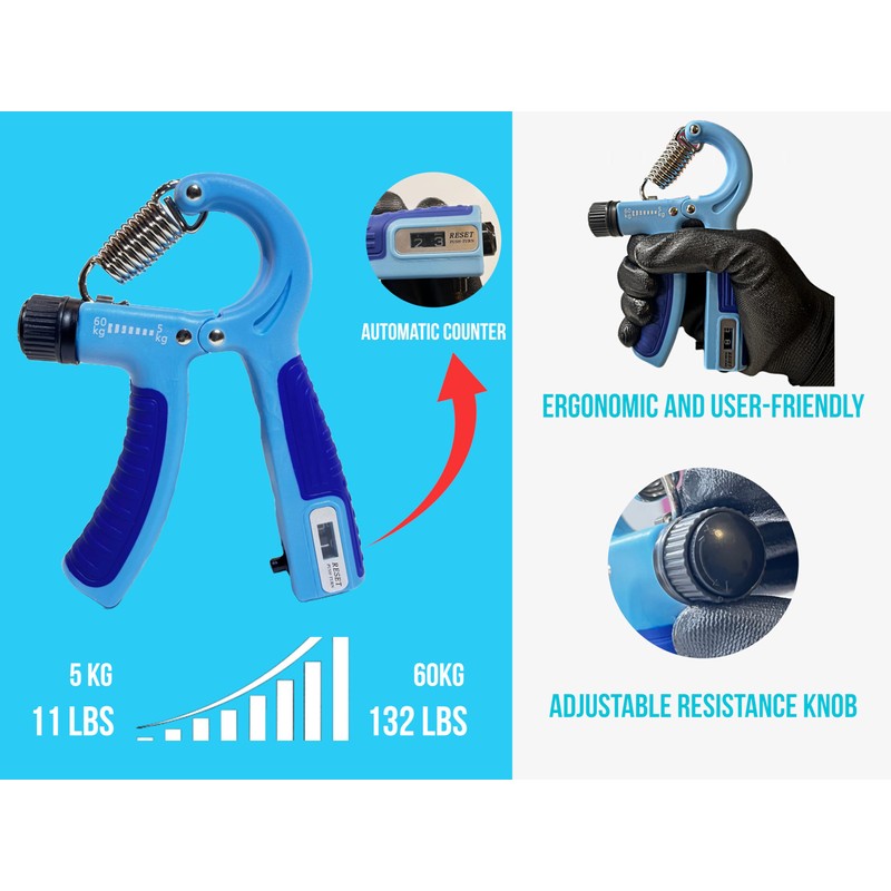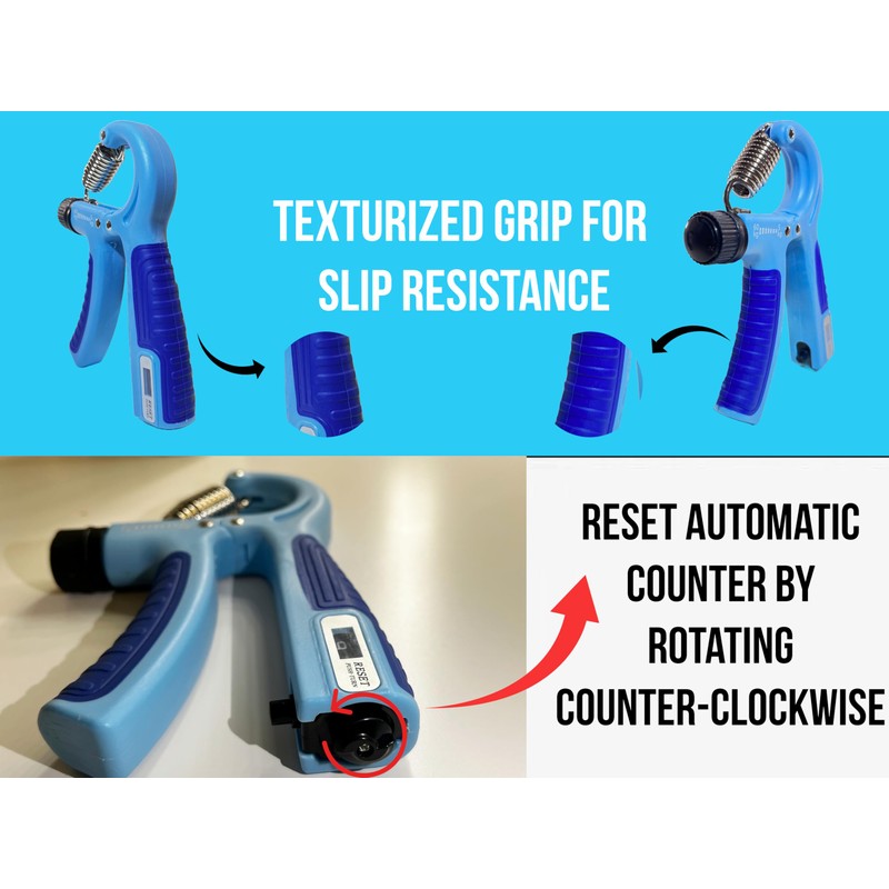 - AUTOMATIC COUNTER- Featuring a uniquely designed automatic counter which counts every complete rep or movement. You no longer have to worry about counting as our hand grip strengthener does it for you. Easy reset with a twist of a knob and your count is back to zero!