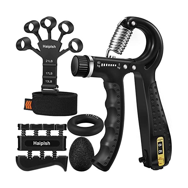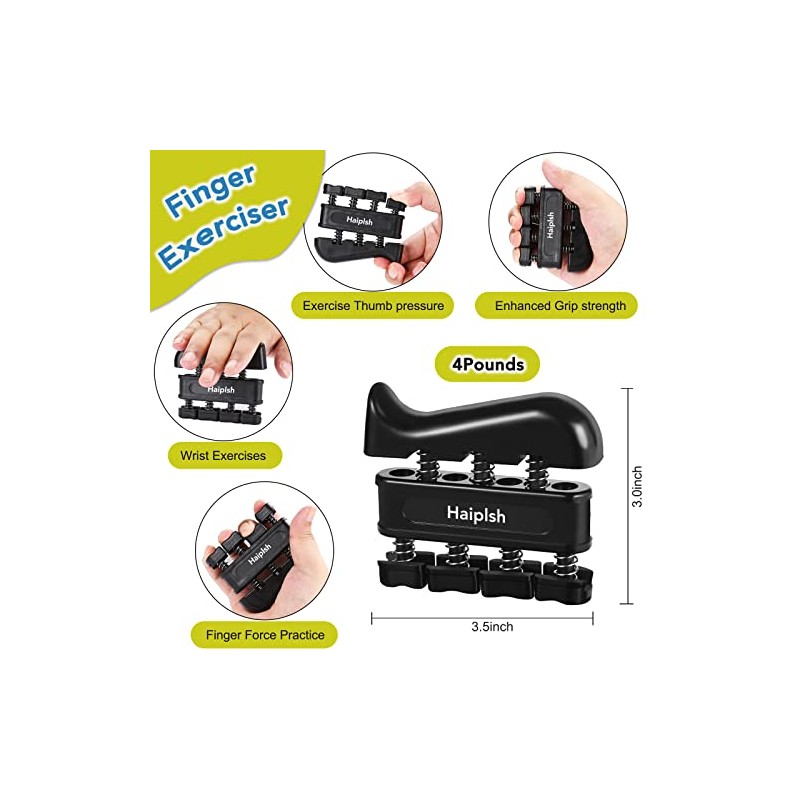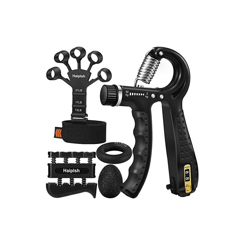 Q: What's inside the package?1 x Adjustable Counting Forearm Gripper (10-132 lbs)1 x Adjustable Finger Resistance Band (13 lbs, 17 lbs, 21 lbs)1 x Finger Exerciser (4 lbs)1 x Stress Relief Ball1 x Hand Strength Ring1 x User Warranty ManualQ: Why choose this combination to enhance forearm grip strength?A: This combination is not only perfect for anyone looking to improve their grip strength and overall hand health, but also without causing fatigue or injury due to excessive one-sided exertion.