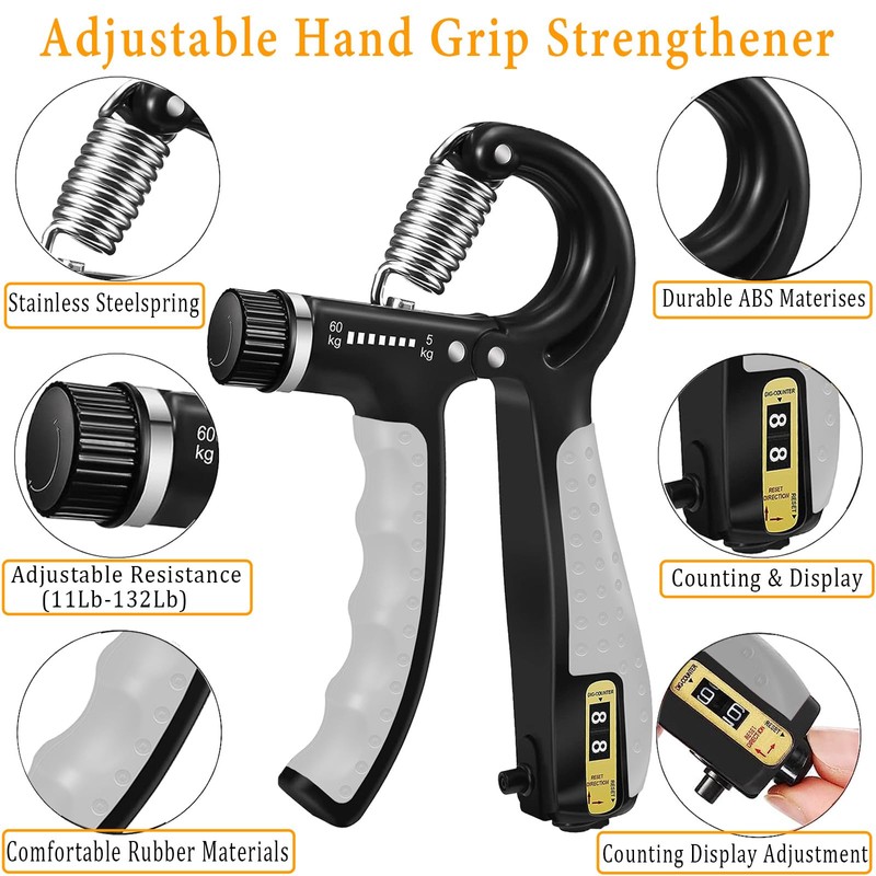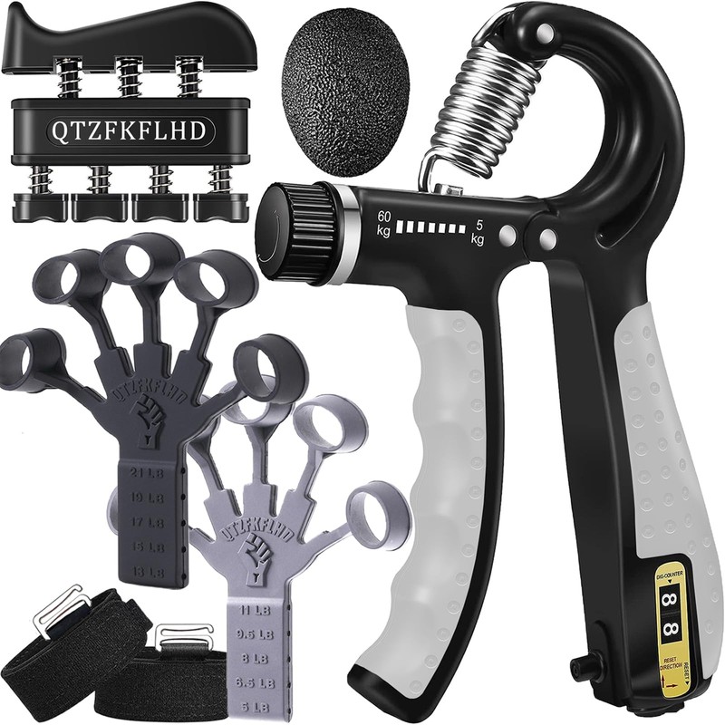 - Hand Grip Strengthener Workout Kits : The grip trainer set includes an adjustable forearm gripper, 10 levels of forearm strengthener, finger exerciser and squeeze stress ball. Alternating the use of these items can fully exercise the strength and flexibility of the fingers, hands, and forearms.